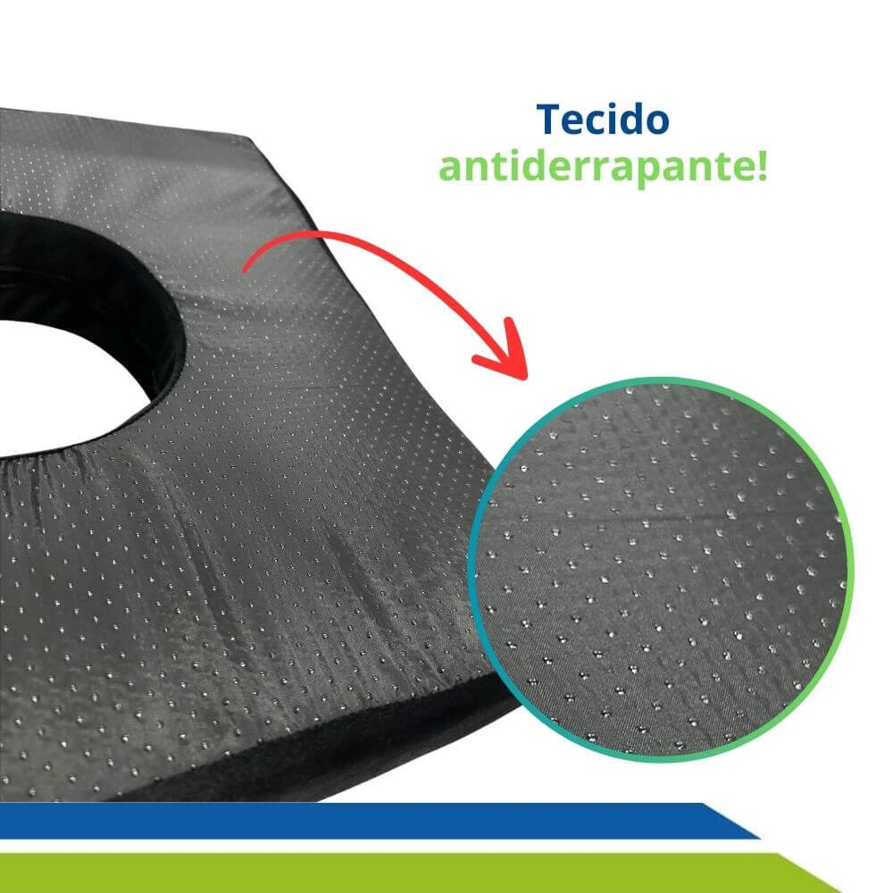 Possui design com orifício central que proporciona alívio da pressão na região do cóccix.