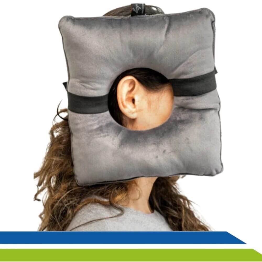 Desenvolvida com orifício central que possibilita o encaixe e proteção perfeita para orelha, além de contar com a faixa elástica que adere a cabeça impossibilitando de que a almofada se desloque, evitando atrito.