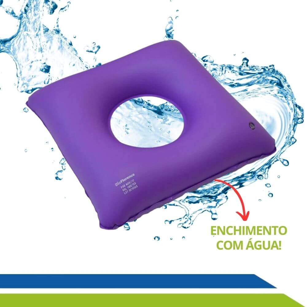 Almofada Quadrada Água com Orifício, ajuda na prevenção e no tratamento da úlcera de pressão (escaras). Pessoas que permanecem sentadas por longos períodos e cadeirantes.