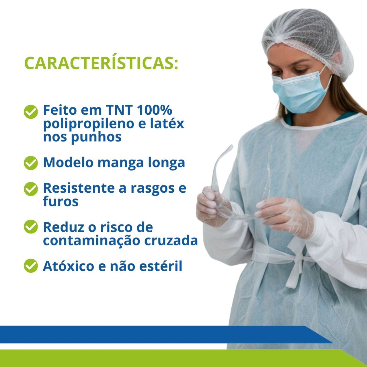 Confeccionado em TNT (tecido não tecido) 100% polipropileno e punho em latéx, é um produto atóxico, não estéril e de uso único, ideal para reduzir riscos de contaminação cruzada em ambientes que exigem altos padrões de higiene.