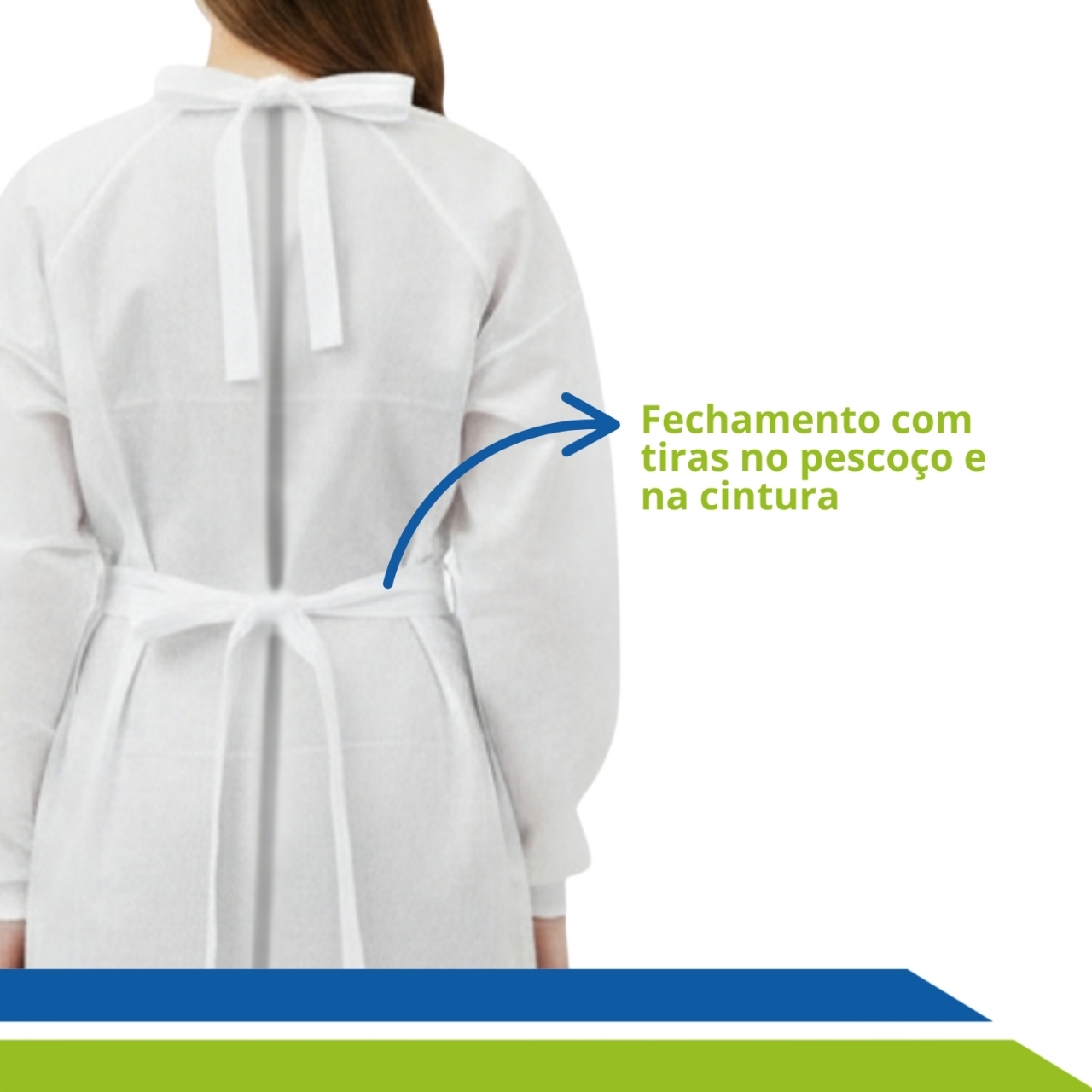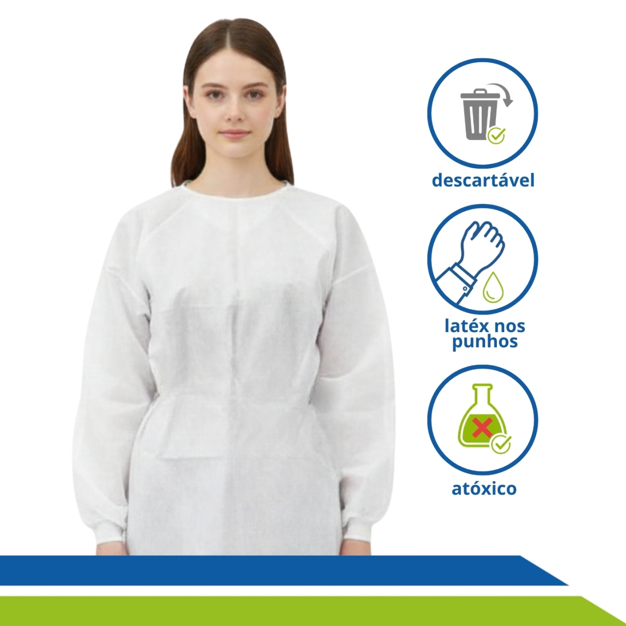 Com gramatura de 30g, o avental oferece excelente equilíbrio entre leveza e resistência, proporcionando liberdade de movimentos sem abrir mão da proteção. Possui mangas longas com punhos em elástico, gola redonda e fechamento por tiras no pescoço e na cintura, garantindo ajuste prático e seguro para diferentes biotipos. Seu tamanho único e cor branca facilitam o uso em rotinas intensas de atendimento.