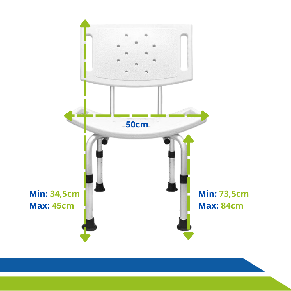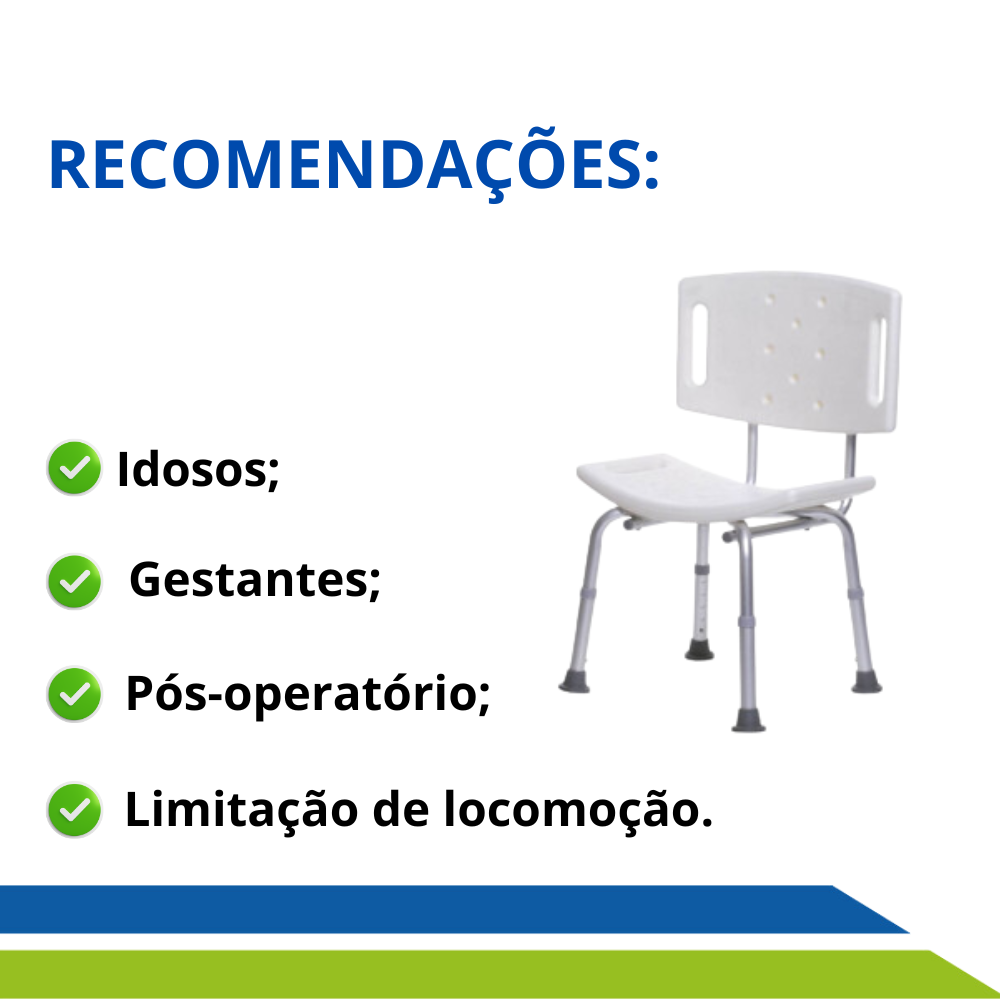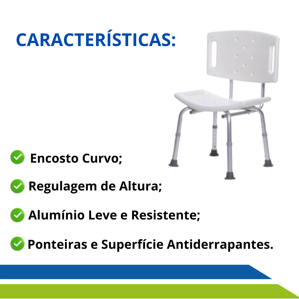 O Banco para Banho com Encosto foi desenvolvido para proporcionar maior equilíbrio e segurança para o usuário, seu assento é curvo, o que o torna mais confortável e seguro. Possui revestimento de borracha nos pés para evitar deslizes, em um momentos que podem ser perigosos devido a presença da água. É produzido com material de alta qualidade em alumínio e conta com 5 regulagens.