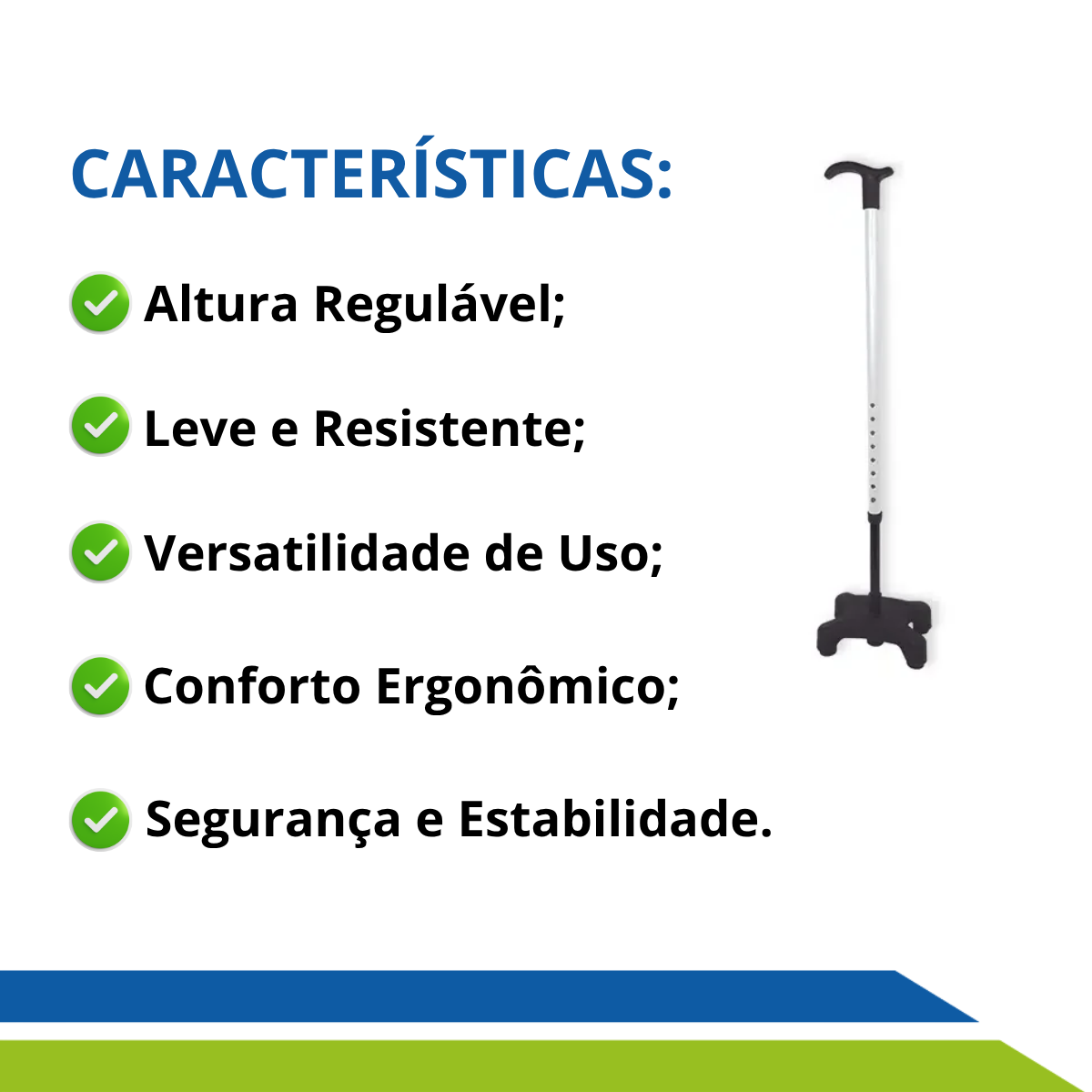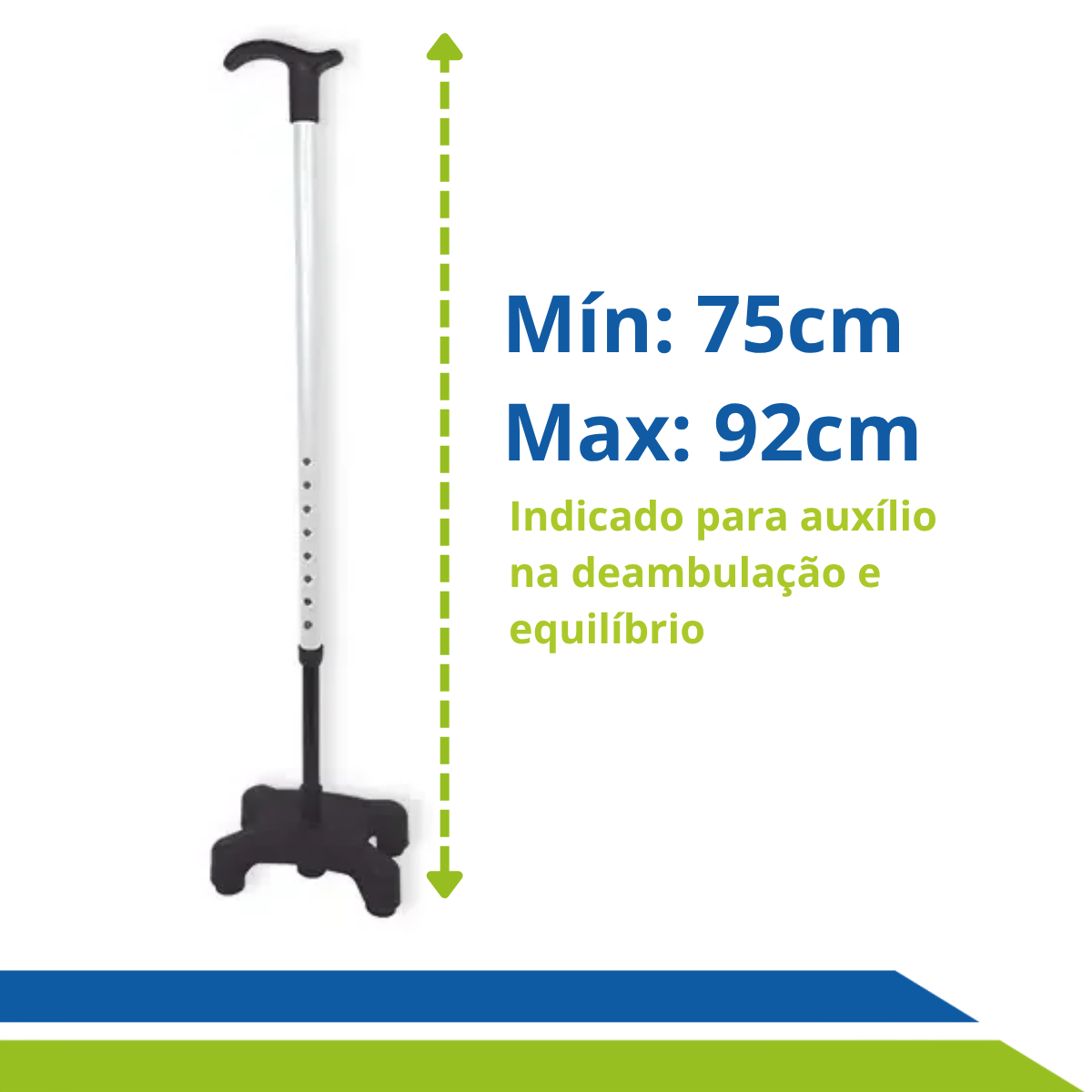 Com base firme de 4 pontas antiderrapantes e ajuste de altura personalizado, você terá o suporte perfeito para caminhar com mais autonomia e tranquilidade no dia a dia.
