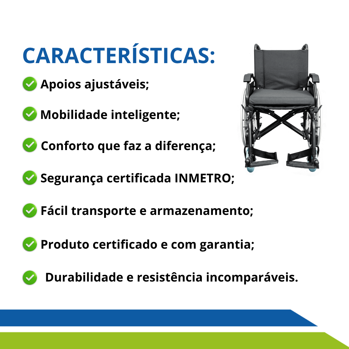 - Apoios ajustáveis: Pés rebatíveis, removíveis e com altura ajustável para atender suas necessidades físicas com precisão.