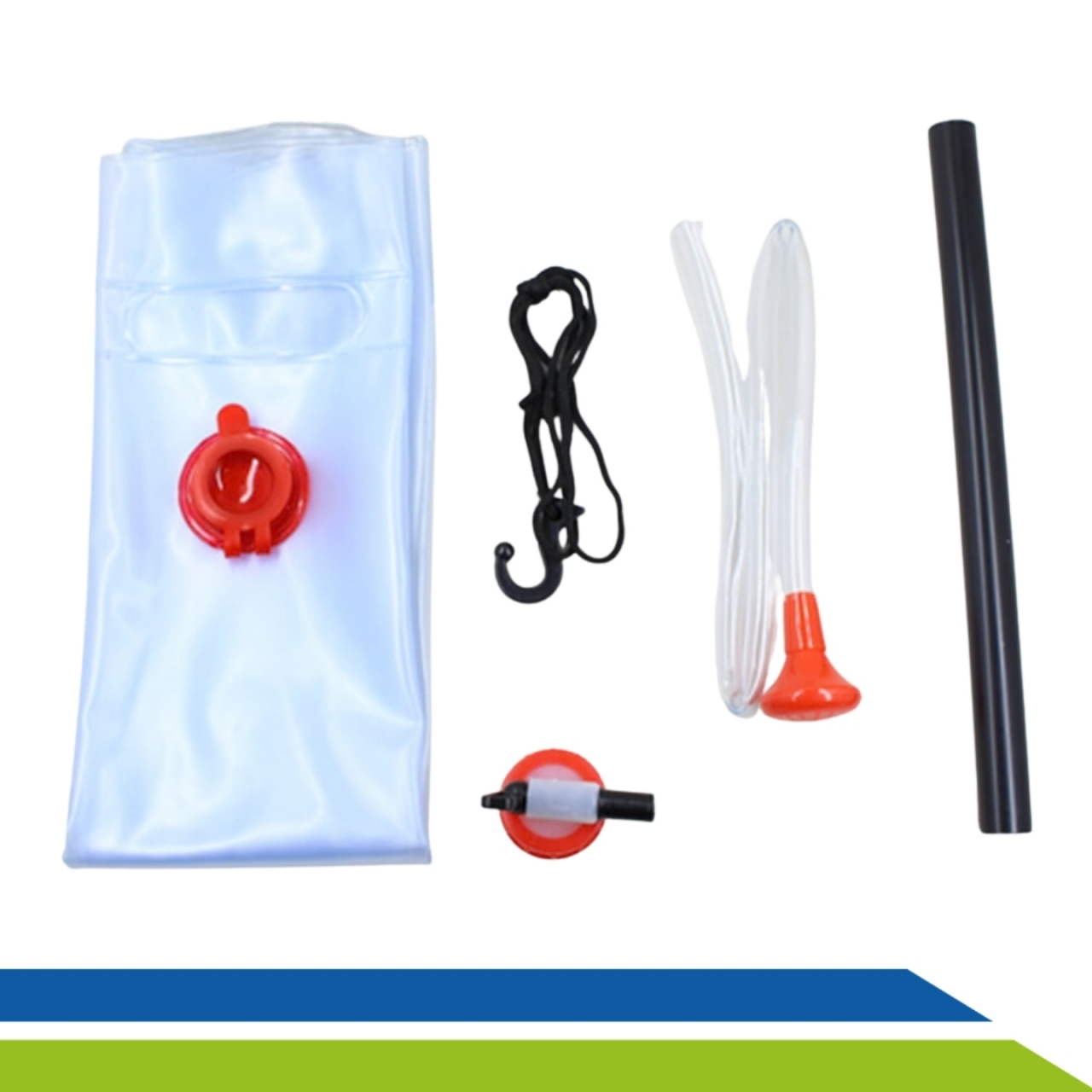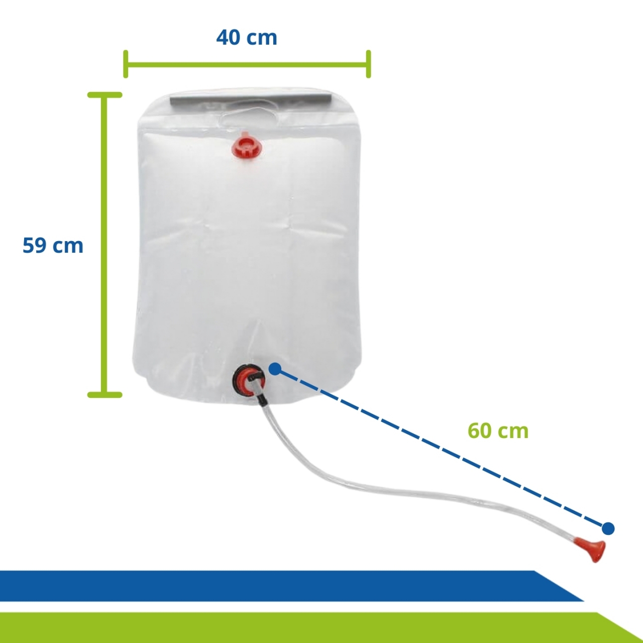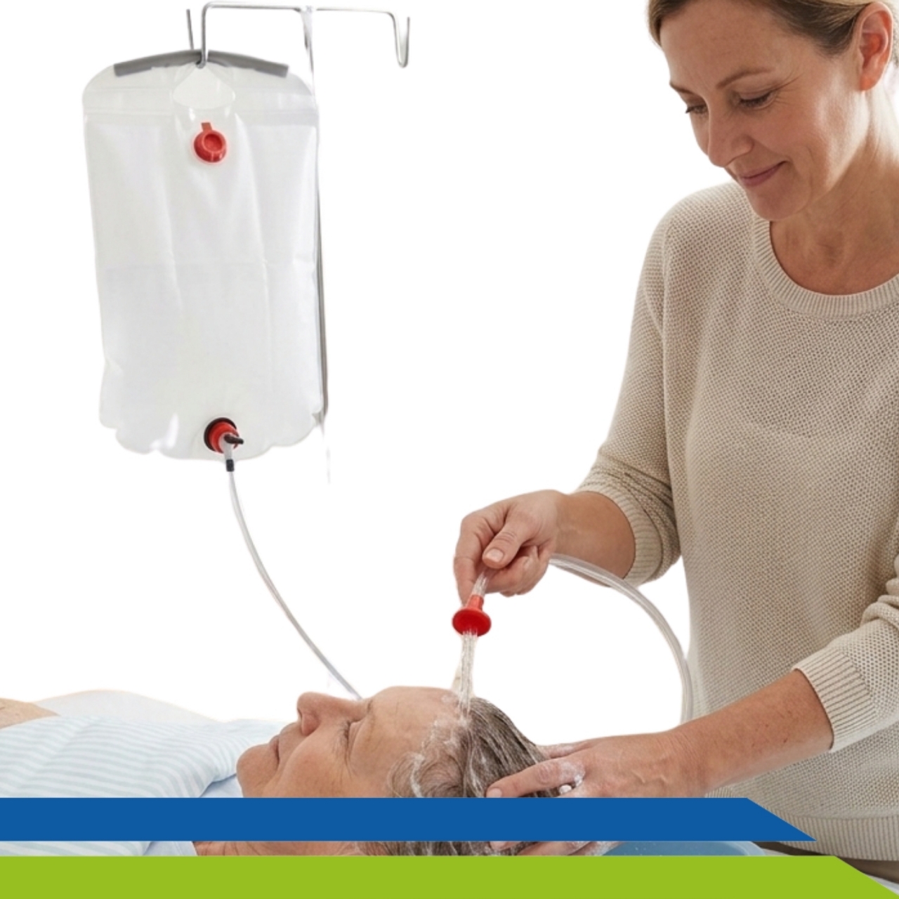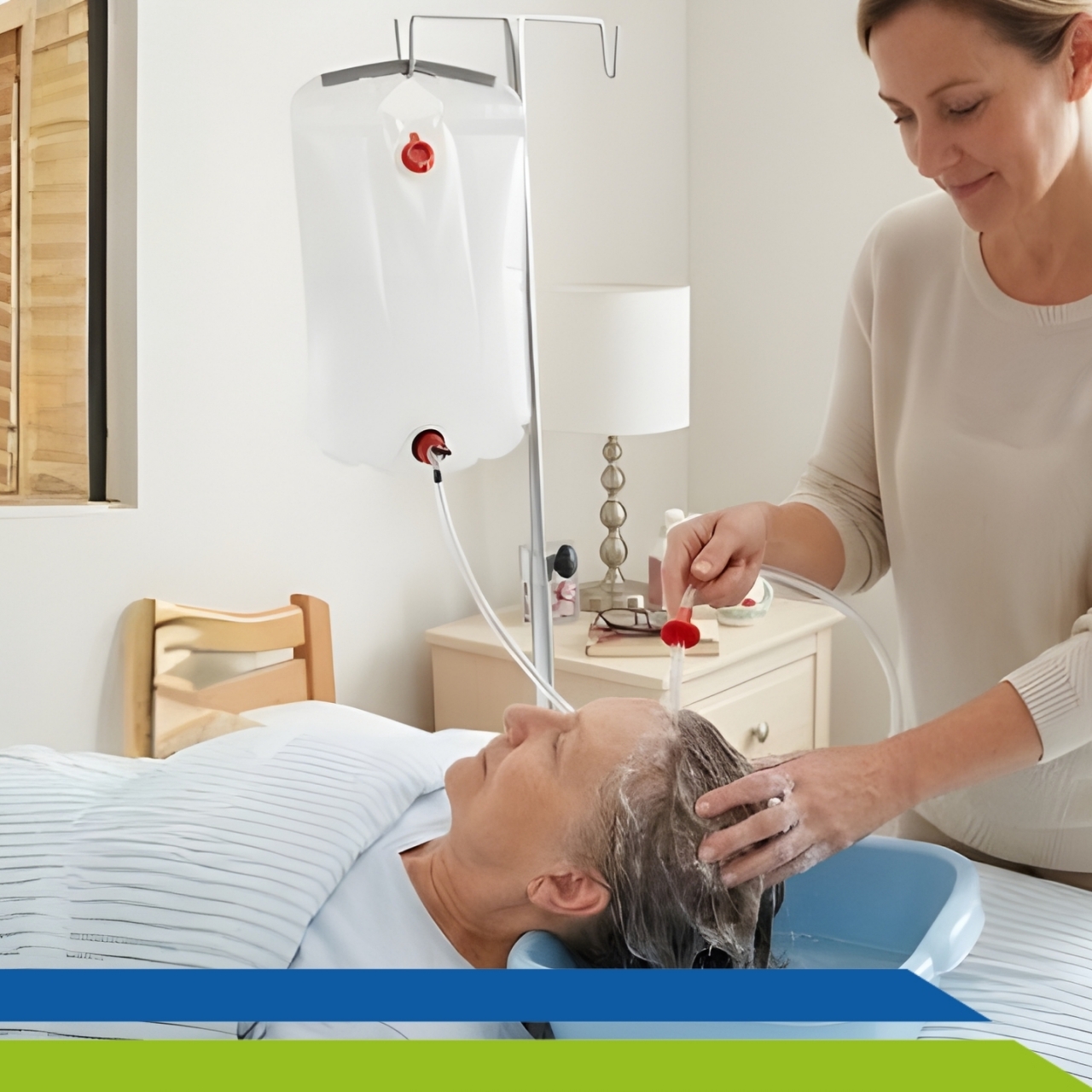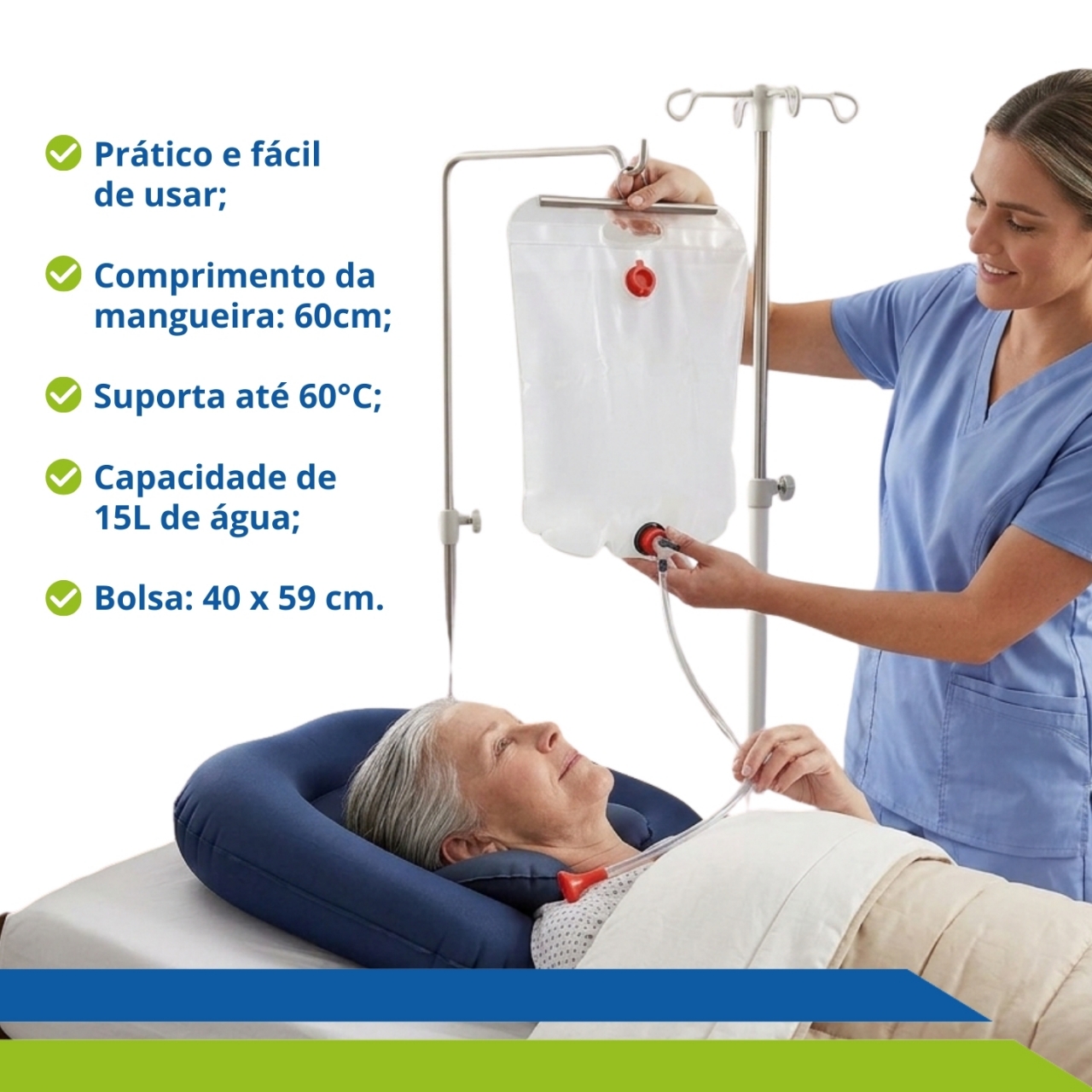 Com capacidade para 15 litros de água, seu chuveiro com torneira regulável, permite direcionar um fluxo suave de água para a cabeça do acamado.