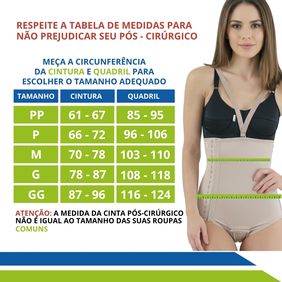 Todas as costuras das cintas são externas para não marcar o corpo nem causar desconforto durante o processo pós-cirúrgico isso porque a pele fica fragilizada e esse desconforto pode atrapalhar o resultado da cirurgia.