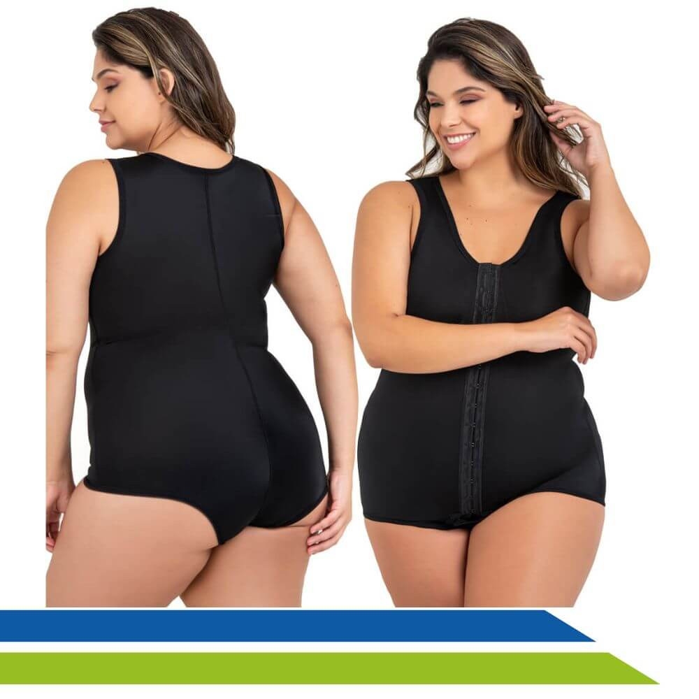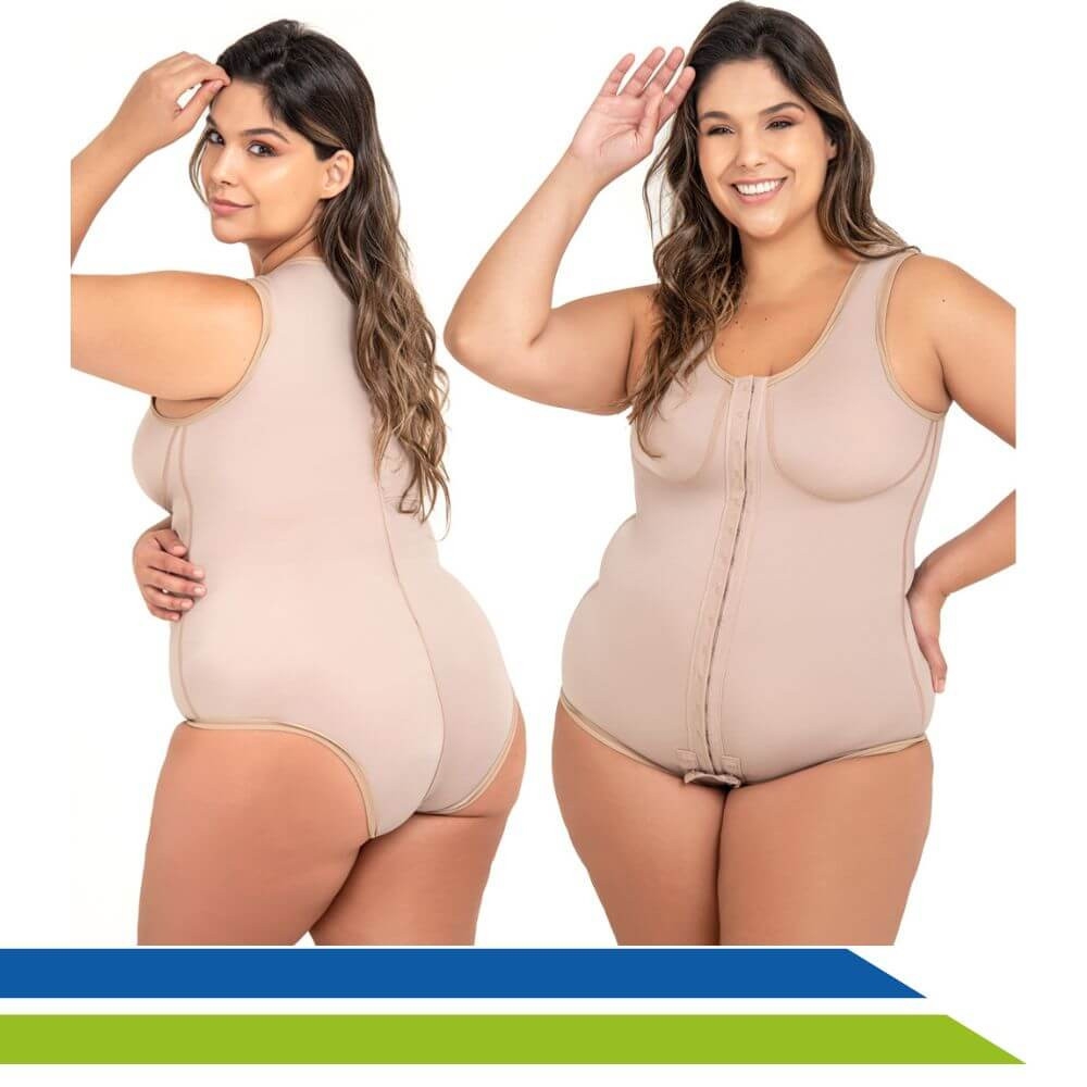O Body Regata Plus Size com colchetes frontais New Form, possui alças largas e fechamento total das costas, costuras reforçadas e externas para não marcar a região operada, com abertura frontal em colchetes com duas fileiras para regulagem, possui também abertura na região íntima para facilitar o uso no dia a dia.