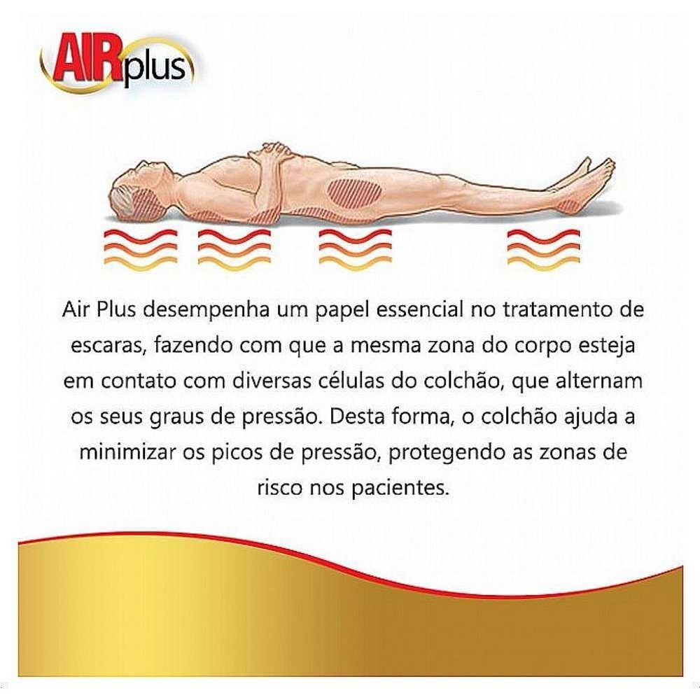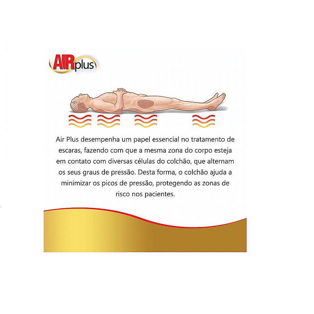 O Sistema Air Plus massageia e estimula os tecidos inativos promovendo a circulação, é simples de usar e Econômico. Suporta o corpo todo do paciente em uma superfície horizontal confortável. Em um ciclo de 5 minutos para inflar e desinflar, alterna a pressão de ar em cada célula.