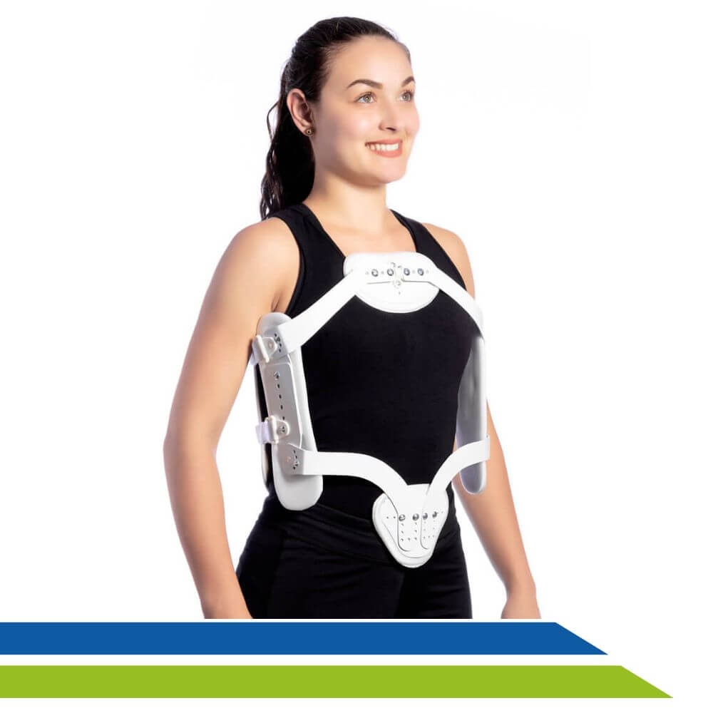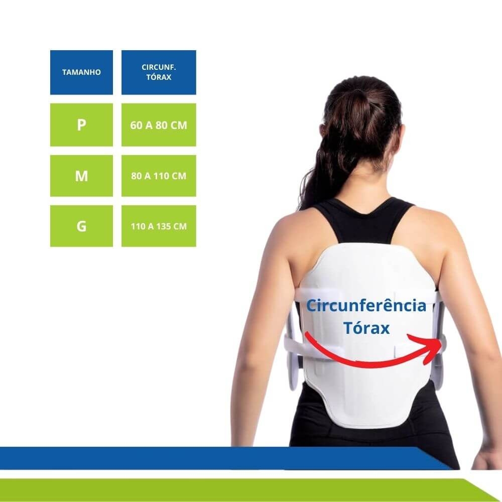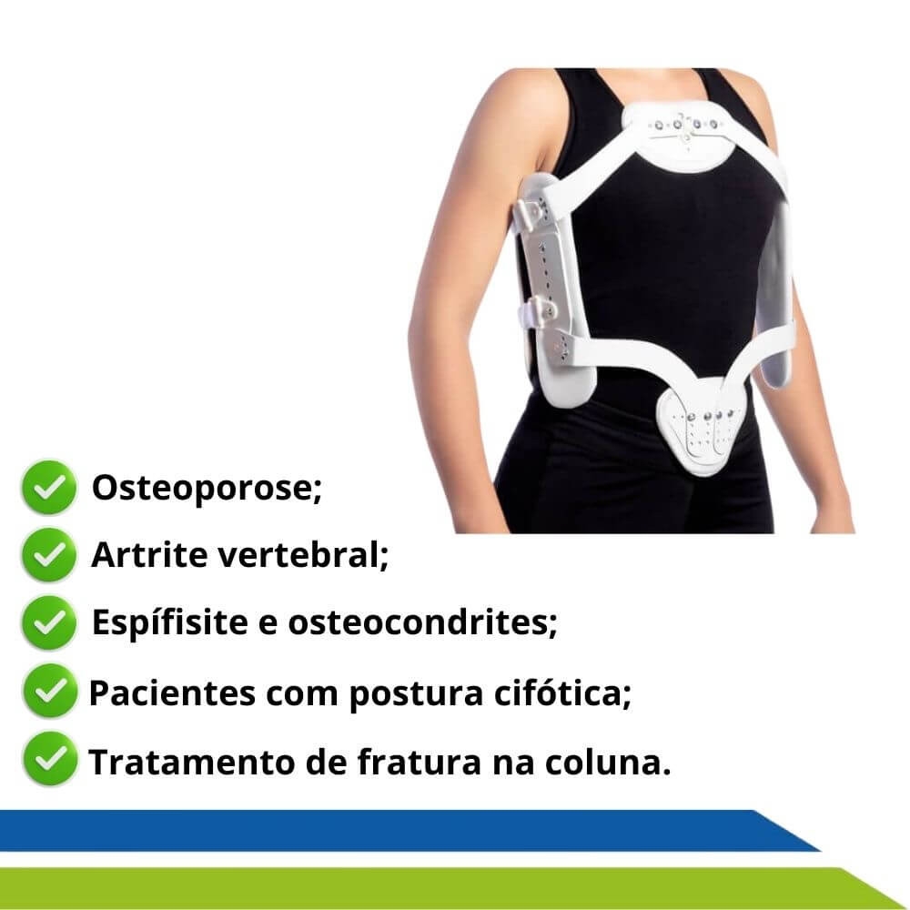 Pesando cerca de 450g, ele deve ser usado apenas sob recomendação médica ou de especialistas, assim como também deve ser ajustado por tais profissionais. Disponível nos tamanhos P, M e G, ele é regulável e fixo ao corpo, promovendo segurança e firmeza ao paciente que precisa manter a postura de forma adequada para o sucesso do tratamento.