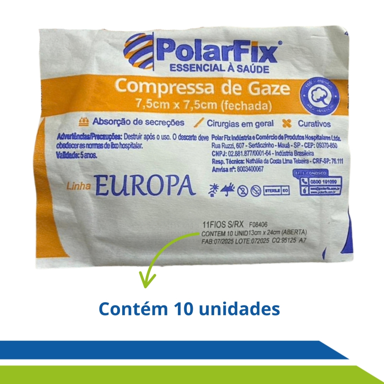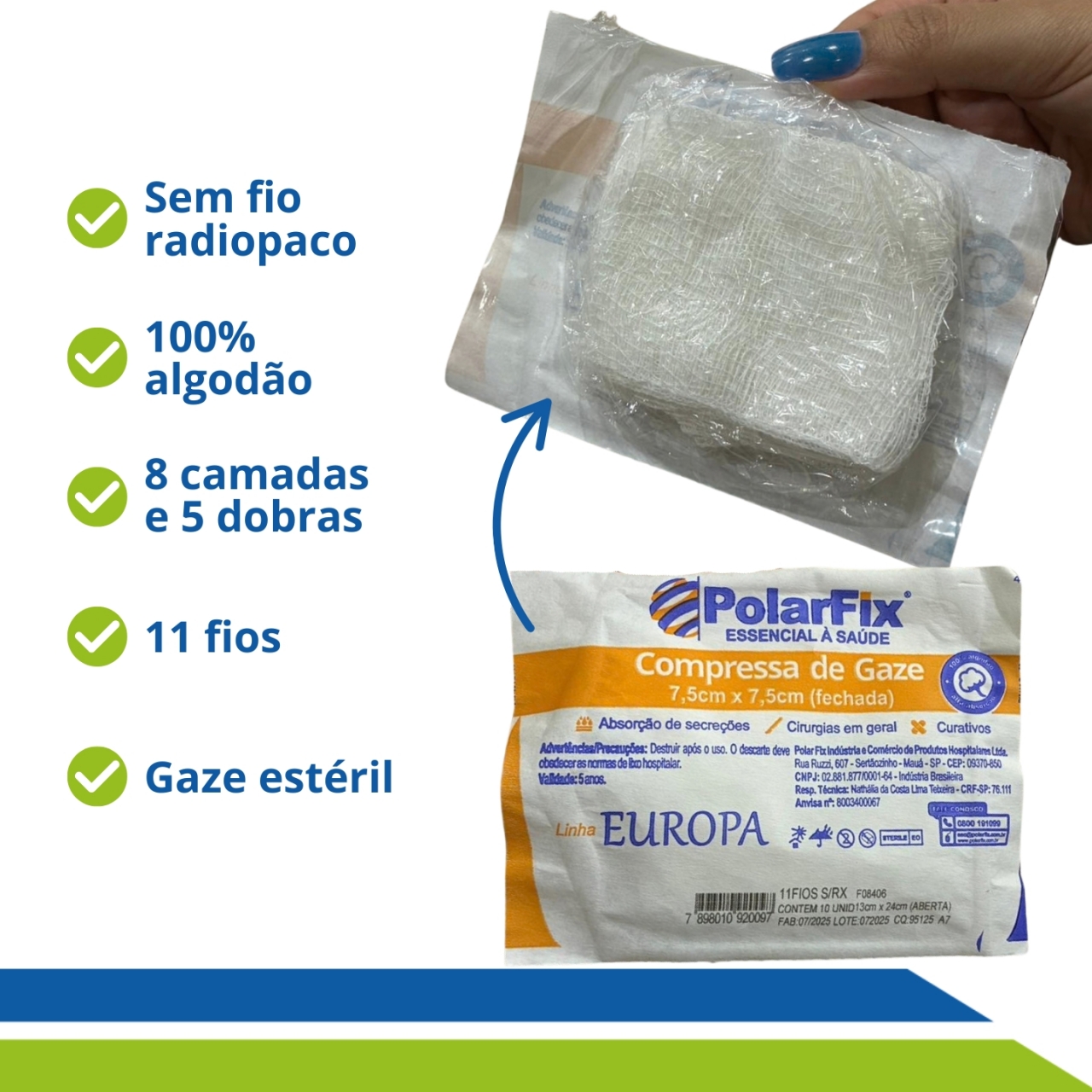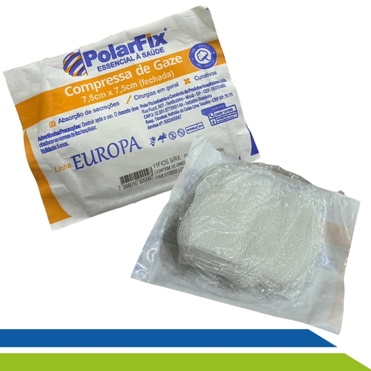 Compressa de Gaze Estéril Europa PolarFix, produzida em 100% algodão, com 8 camadas e 5 dobras, garantindo maciez, alta absorção e segurança em curativos e procedimentos clínicos ou domésticos.