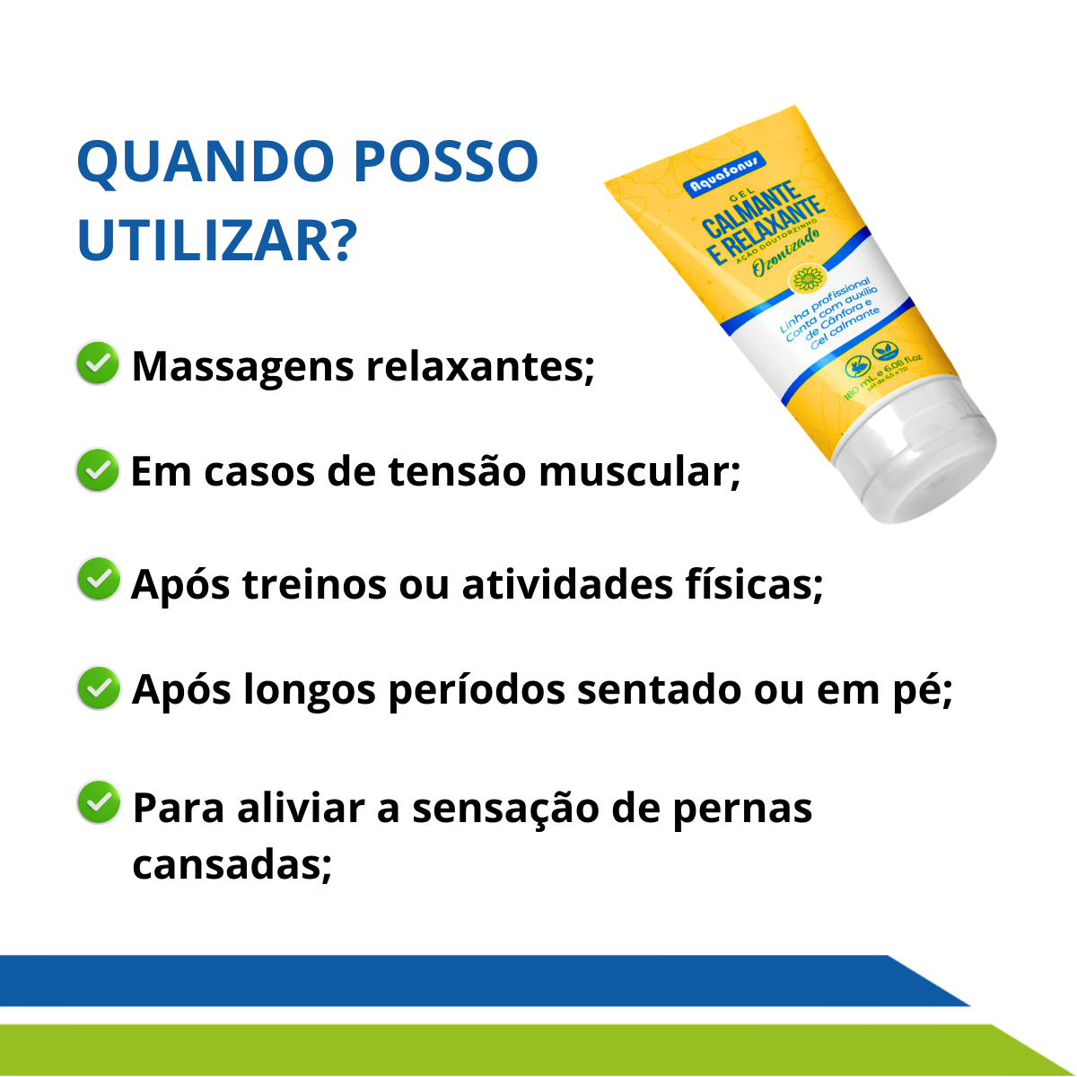 Perfeito para usar após treinos, caminhadas, longos períodos em pé ou sempre que houver tensão muscular.