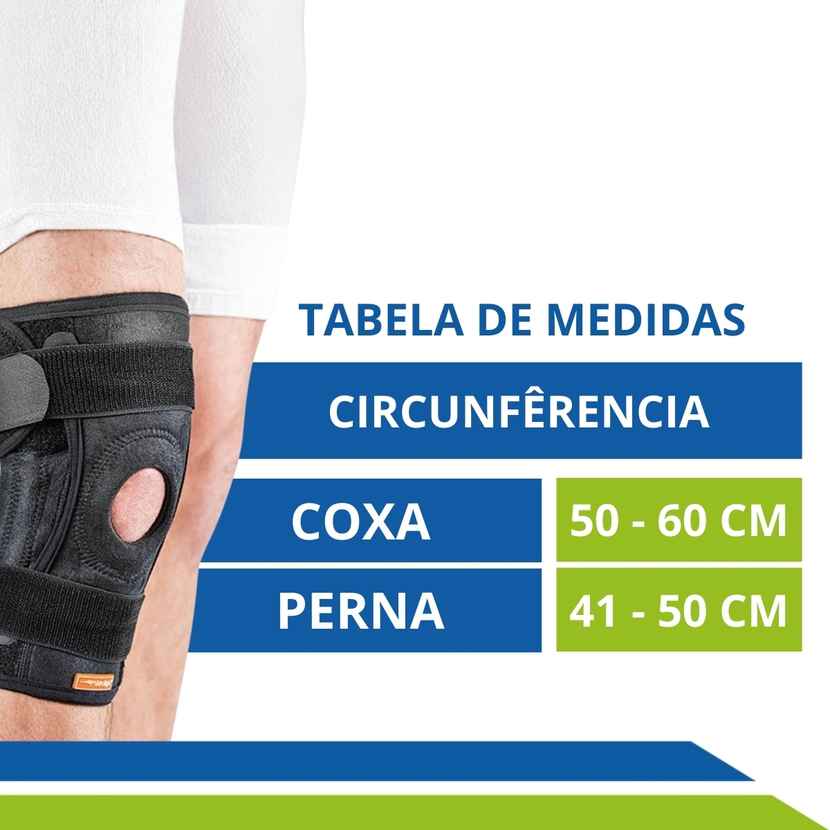 Meça a circunferência da coxa e da perna (abaixo do joelho), compare as medidas com as da tabela de medidas.