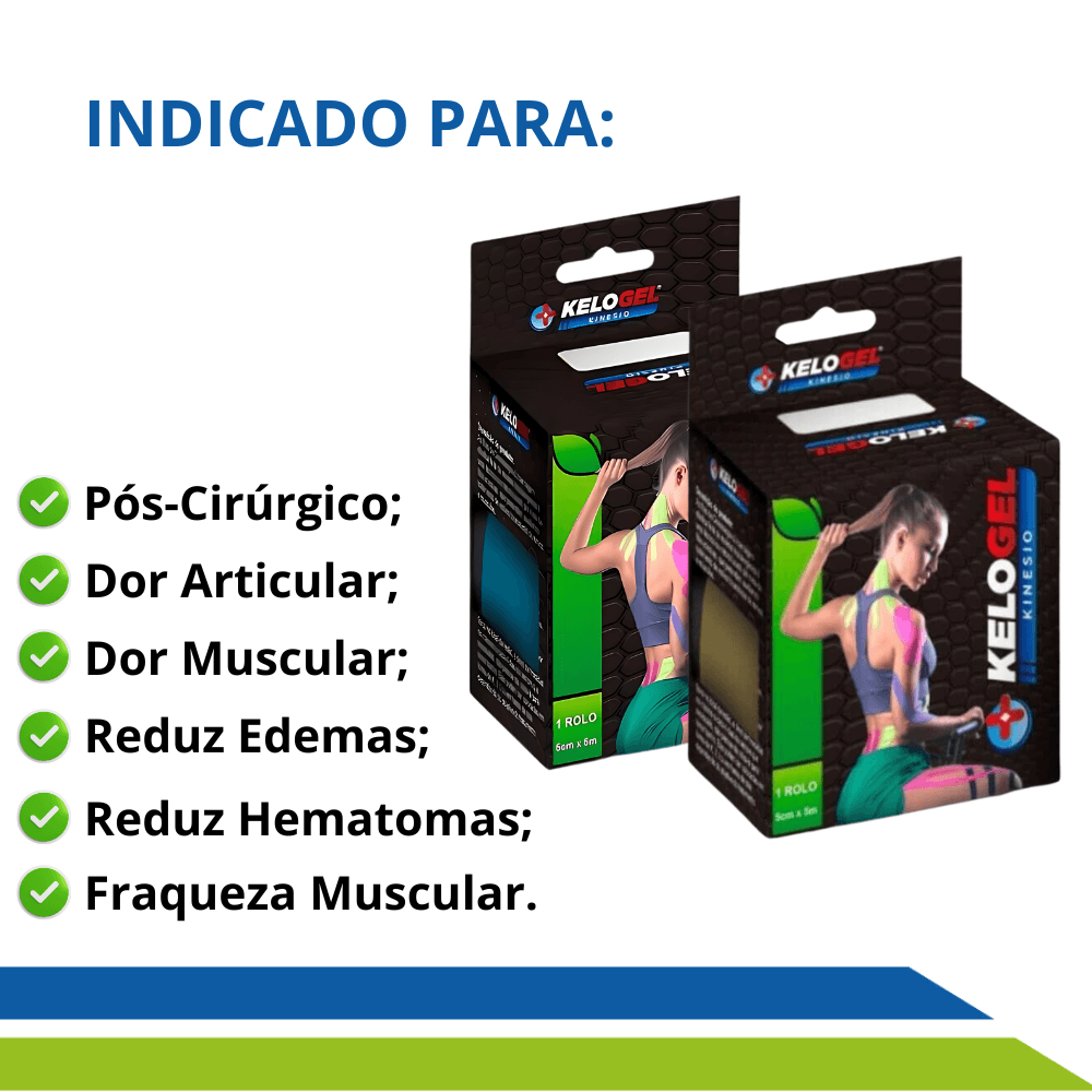 Fita de Kinesio Kelogel é o suporte que você precisa para enfrentar os desafios do dia a dia com mais conforto e segurança. Ideal para quem busca alívio nas dores musculares e articulares, ela é indispensável durante o pós-operatório, cirurgias plásticas, pós-parto, lesões e suporte de treinos em academia.