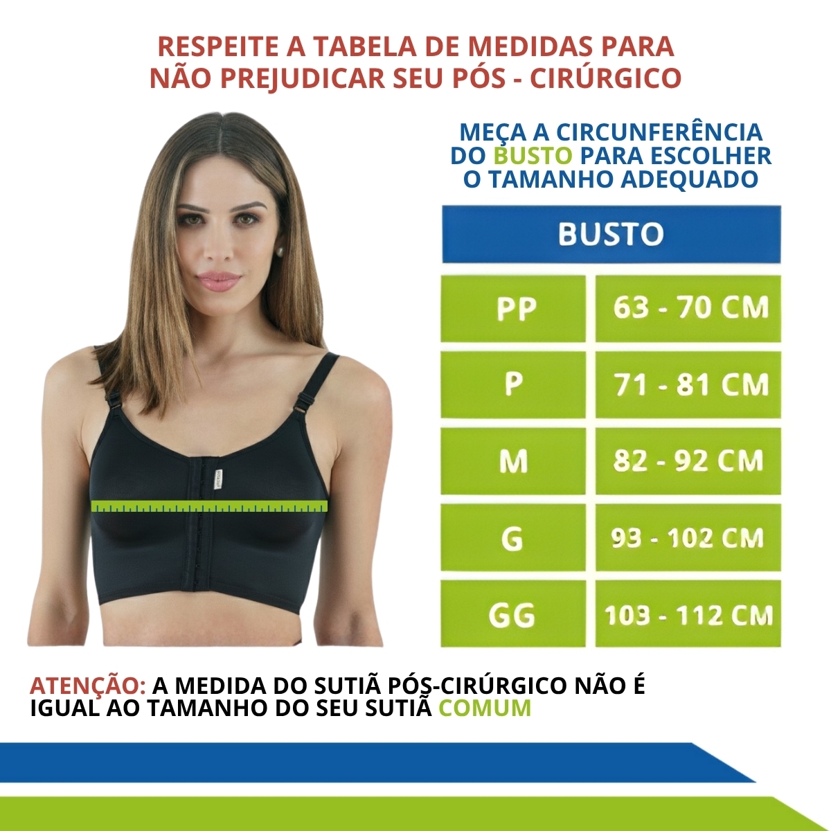 A medida a levar em consideração no momento da compra é justamente a circunferência abaixo do seio já que o sutiã tem a finalidade de dar sustentação ao seio e não deixar que as próteses se movimentem durante o processo pós-operatório.