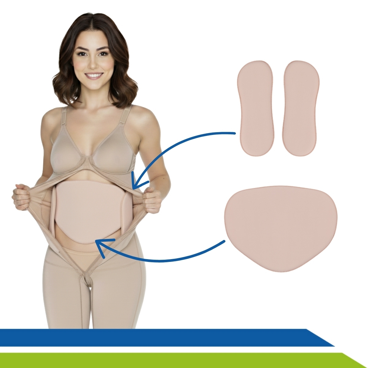 Kit Pós-Cirúrgico com Cinta Completa, tipo macaquinho modelo 2018 e kit de placas em espuma, frontal e lateral, ideal para uso após cirurgias de lipoaspiração, abdominoplastia, entre outras.