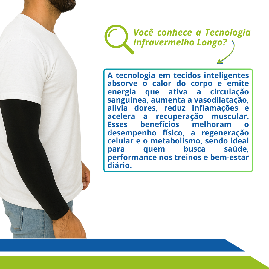 Desenvolvido com tecnologia ativada pelo calor do próprio corpo, ele atua diretamente na estimulação da circulação sanguínea, no alívio de dores musculares e na proteção contra os raios solares, tornando-se perfeito para treinos, corridas, ciclismo e uso diário.