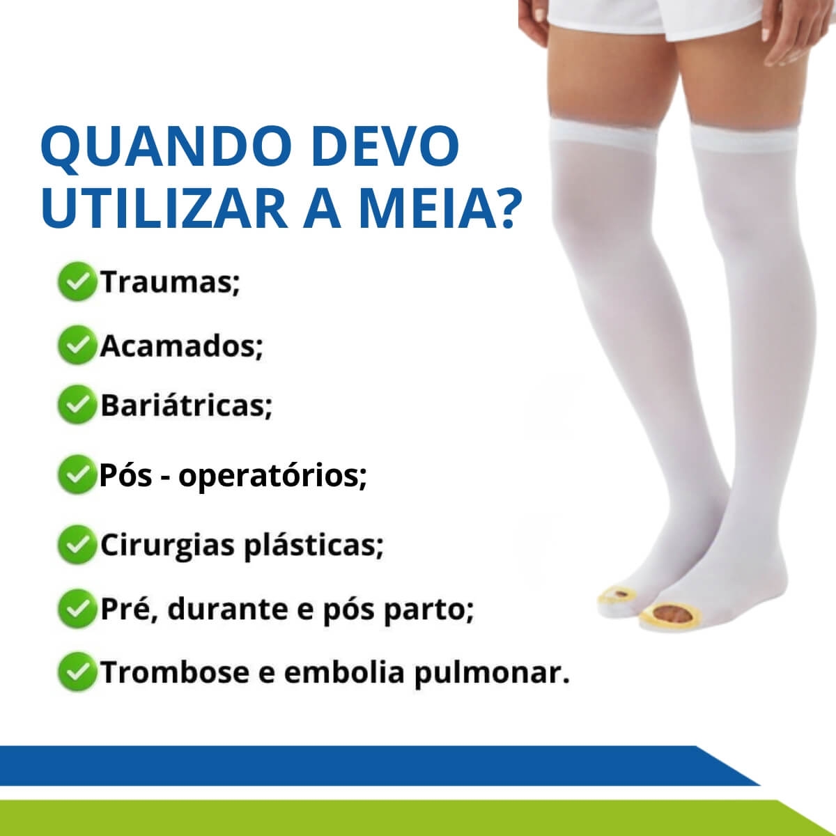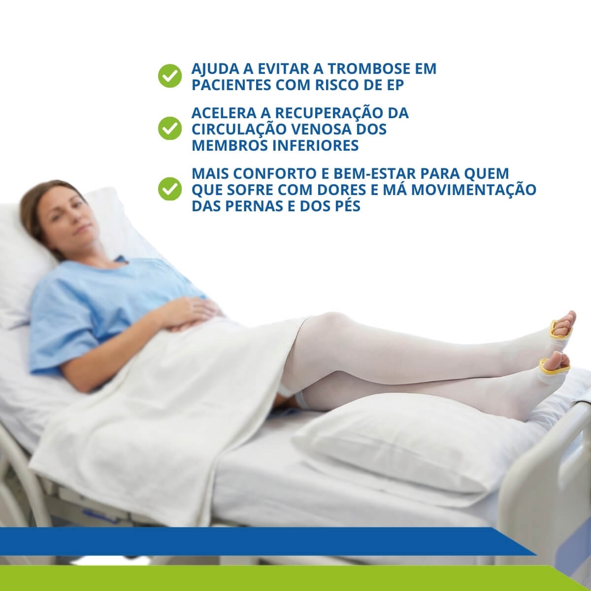Indicada para hospitais e pacientes que irão realizar cirurgias, oferecendo compressão graduada que ajuda o sangue a retornar ao coração — essencial para evitar Trombose, EP e TVP. Recomendamos sempre consultar seu médico.