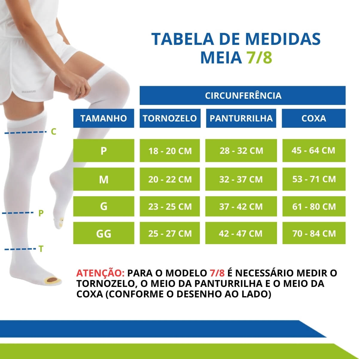 Para determinar o tamanho correto, meça a circunferência do tornozelo, da panturrilha e da metade da coxa.