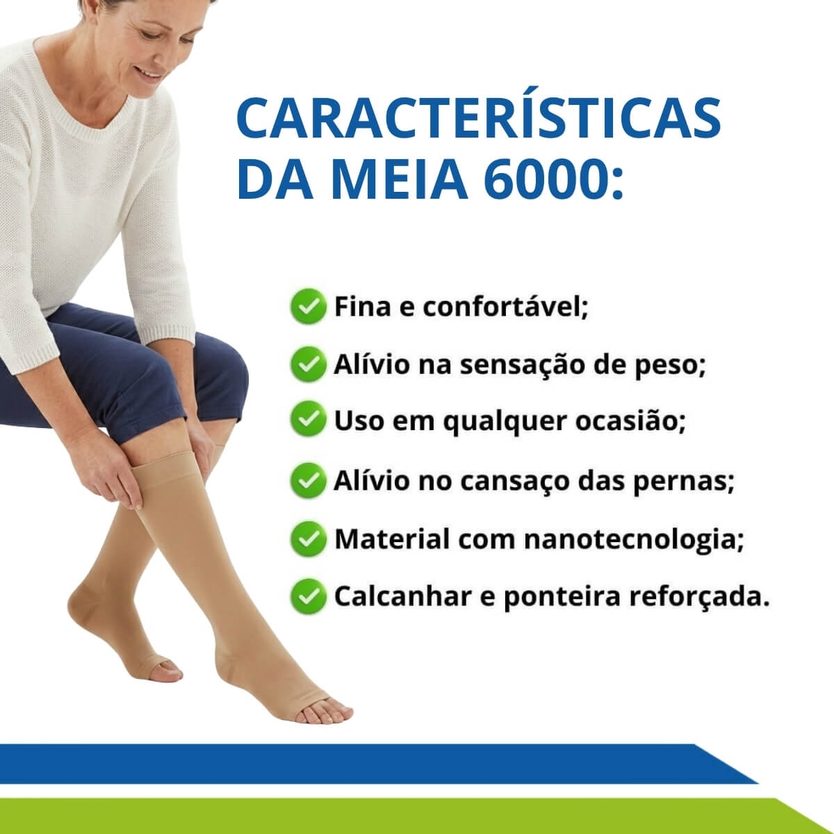 Reduz cansaço, inchaço e melhora a circulação. Indicada para quem fica muito tempo em pé, sentado, gestantes ou viajantes. Promove terapia de compressão auxiliando o retorno venoso.