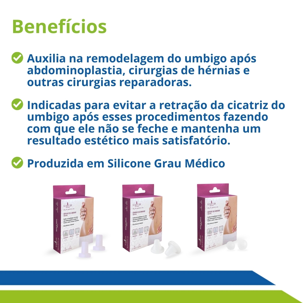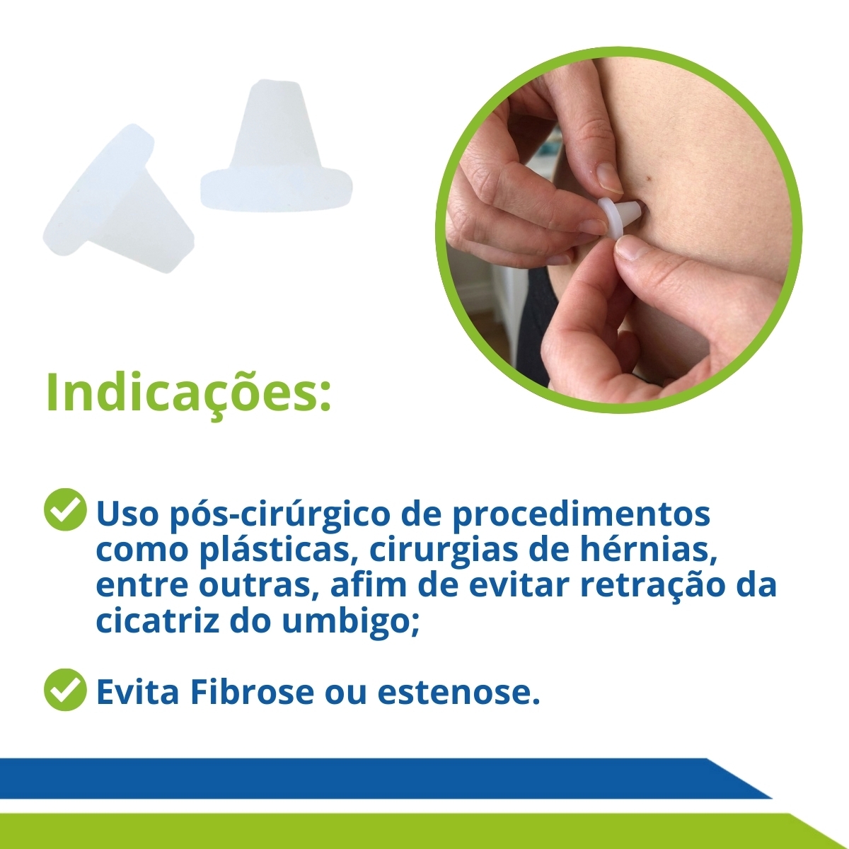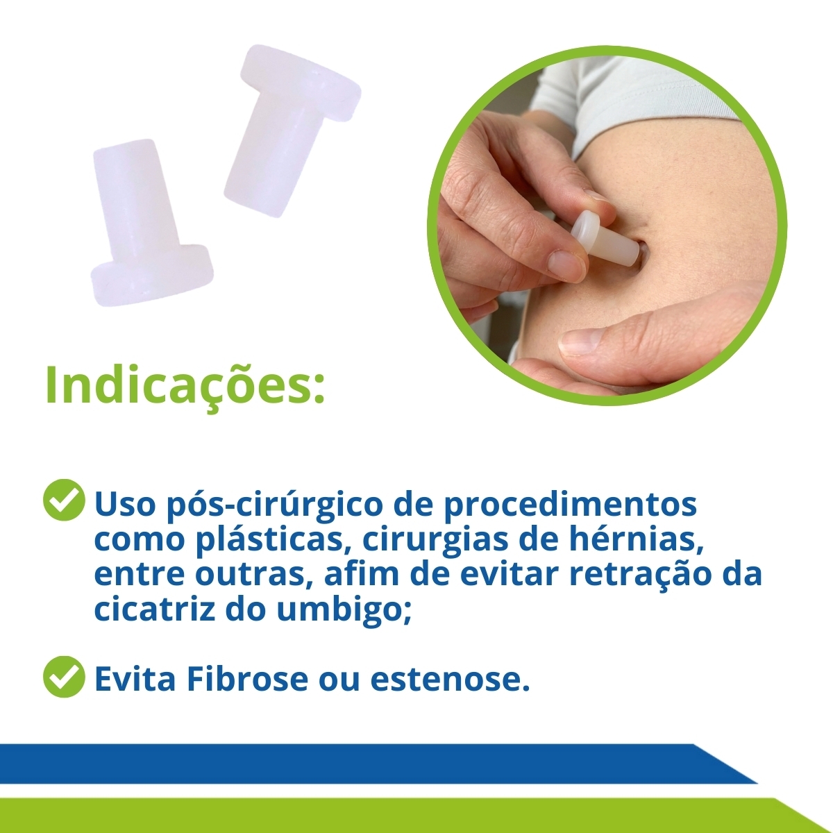 Disponíveis nos formatos anatômico, esférico e cilíndrico, permitem que o profissional de saúde indique a opção mais adequada conforme a anatomia e a evolução do processo de cicatrização. Seu uso ajuda a evitar retração da cicatriz umbilical, além de reduzir o risco de fibrose ou estenose, mantendo o umbigo aberto e bem definido.