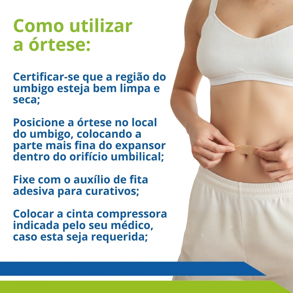 Posicione a órtese no umbigo, inserindo cuidadosamente a parte mais fina no orifício umbilical;