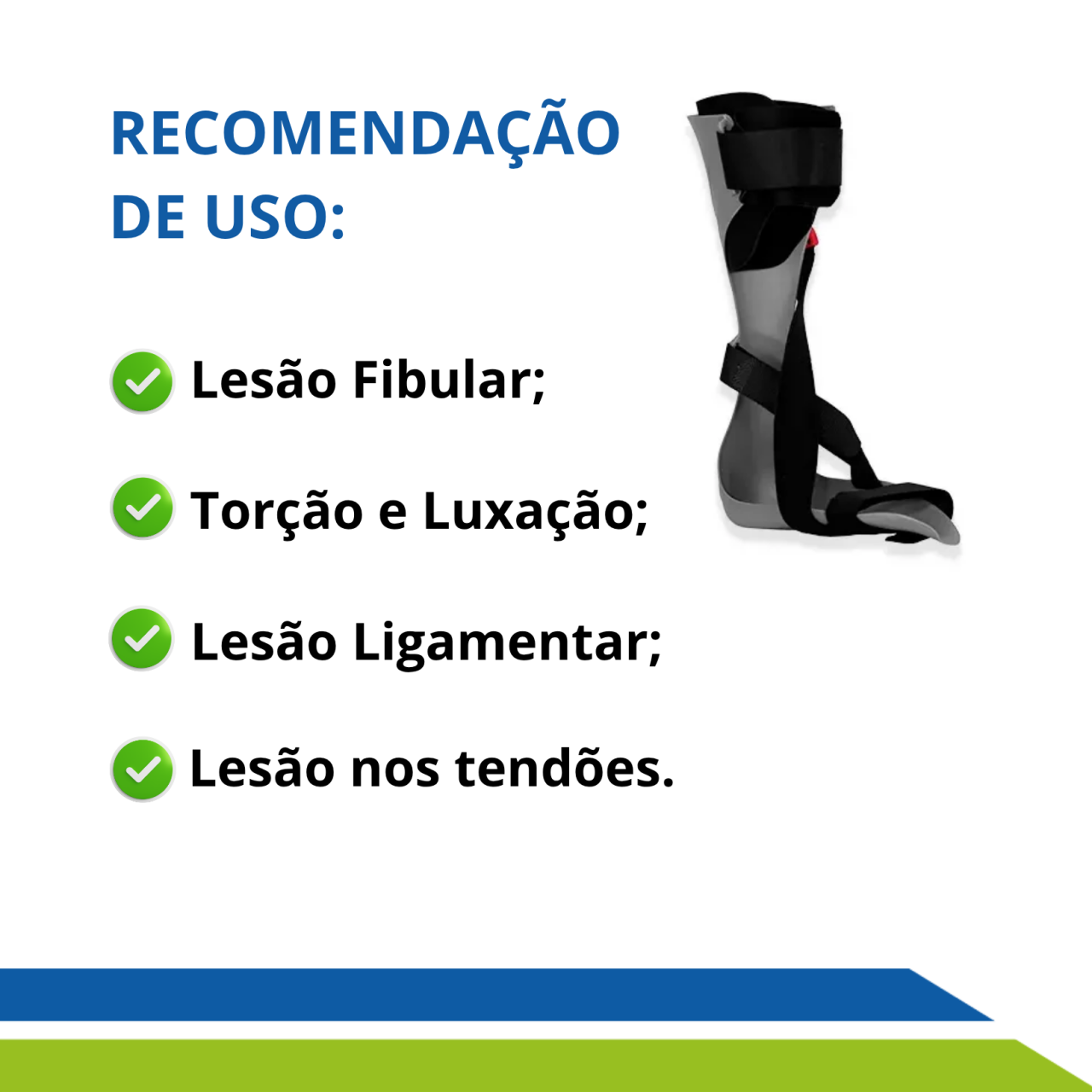 Indicada para lesões dos ligamentos talofibular e calcaneofibular anterior, além de lesões da fíbula, proporciona suporte seguro ao tornozelo, ajudando na recuperação e evitando movimentos que possam comprometer o processo de cicatrização.
