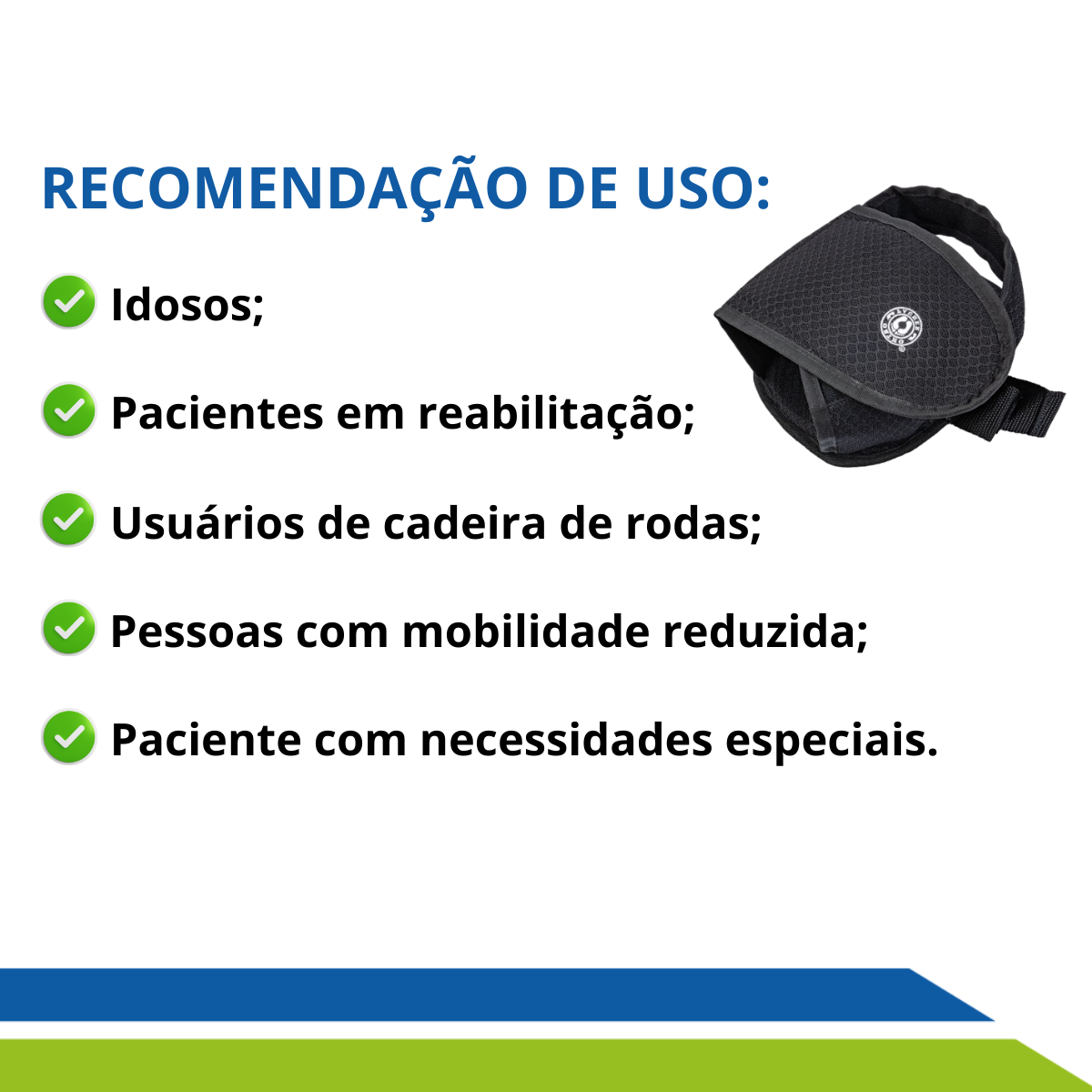 Ele auxília a evitar escorregamentos, proporciona estabilidade na cadeora de rodas e reduz riscos de acidentes.