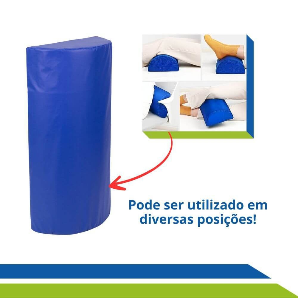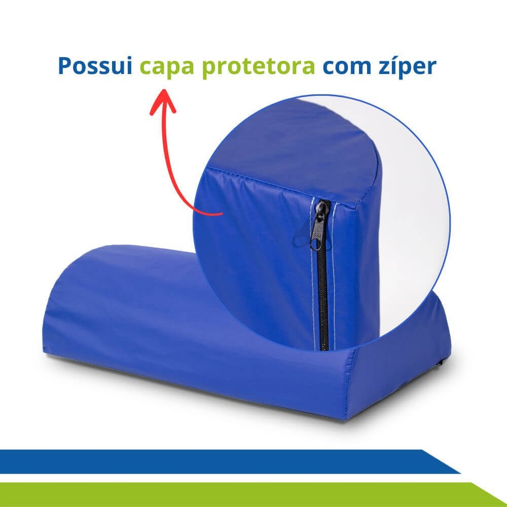 Sua superfície lisa e macia, revestida em tecido 100% poliéster com acabamento em napa azul impermeável, facilita a limpeza e higienização, garantindo praticidade e durabilidade para o dia a dia. Além disso, o rolo possui formato meia lua, proporciona adaptabilidade a diferentes partes do corpo.