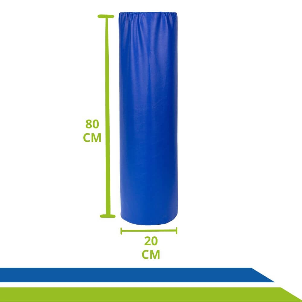 Sua superfície lisa e macia, revestida em tecido 100% poliéster com acabamento em napa azul impermeável, facilita a limpeza e higienização, garantindo praticidade e durabilidade para o dia a dia. Além disso, o rolo possui formato cilíndrico que proporciona adaptabilidade a diferentes partes do corpo.