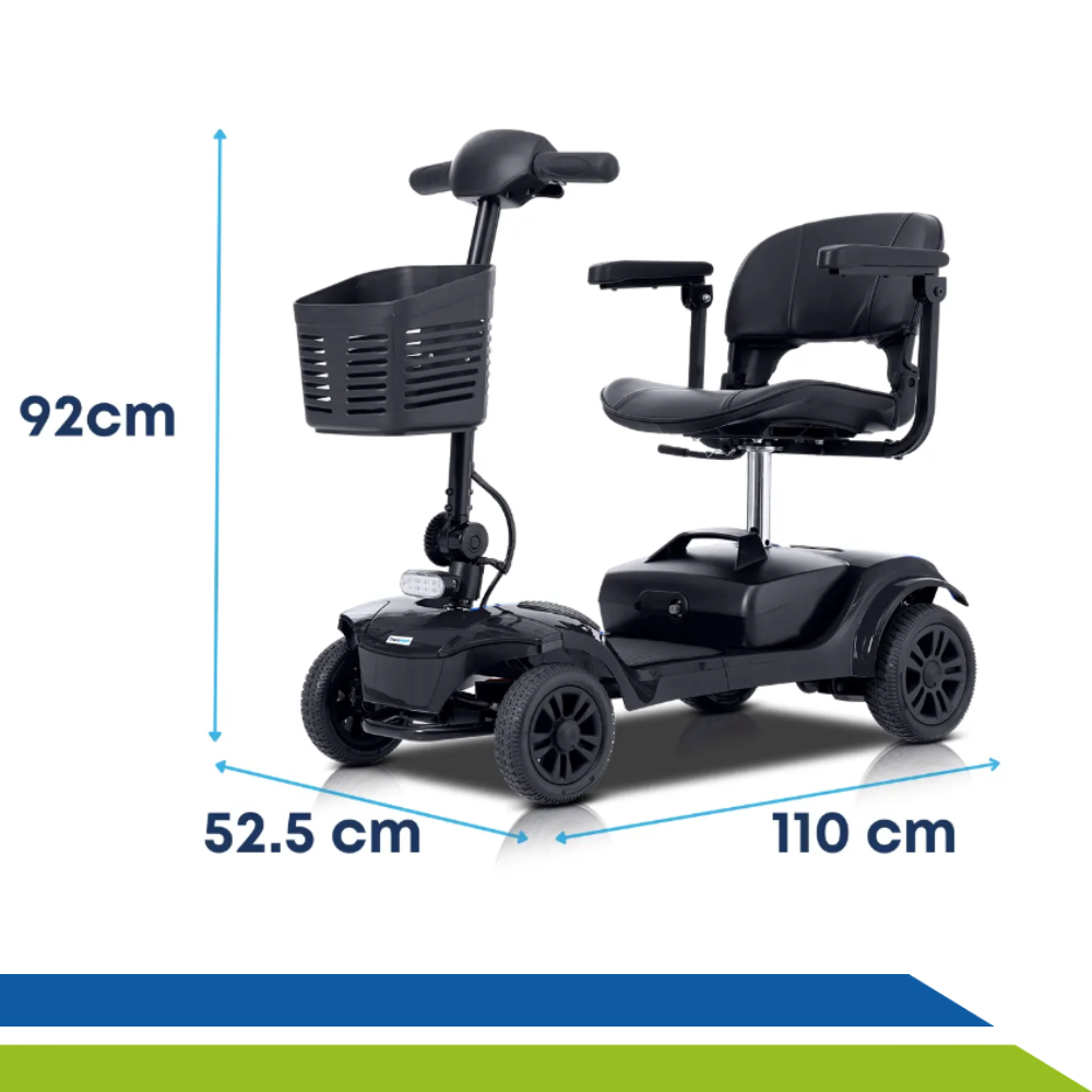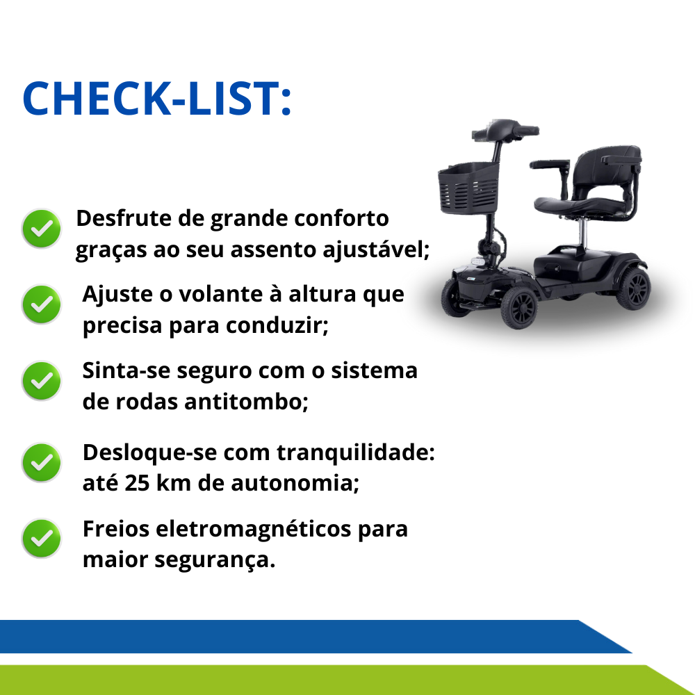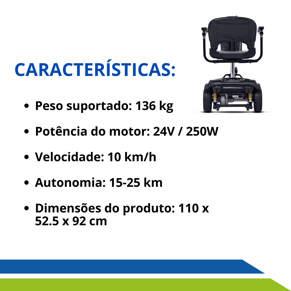 Equipado com um motor potente e silencioso, oferece uma autonomia de até 25 km por carga, sendo ideal para uso em ambientes internos e externos. Sua bateria é fabricada em chumbo sendo autorizada no transporte de viagens em avião, trem ou navio, tornando o seu deslocamento prático e seguro.