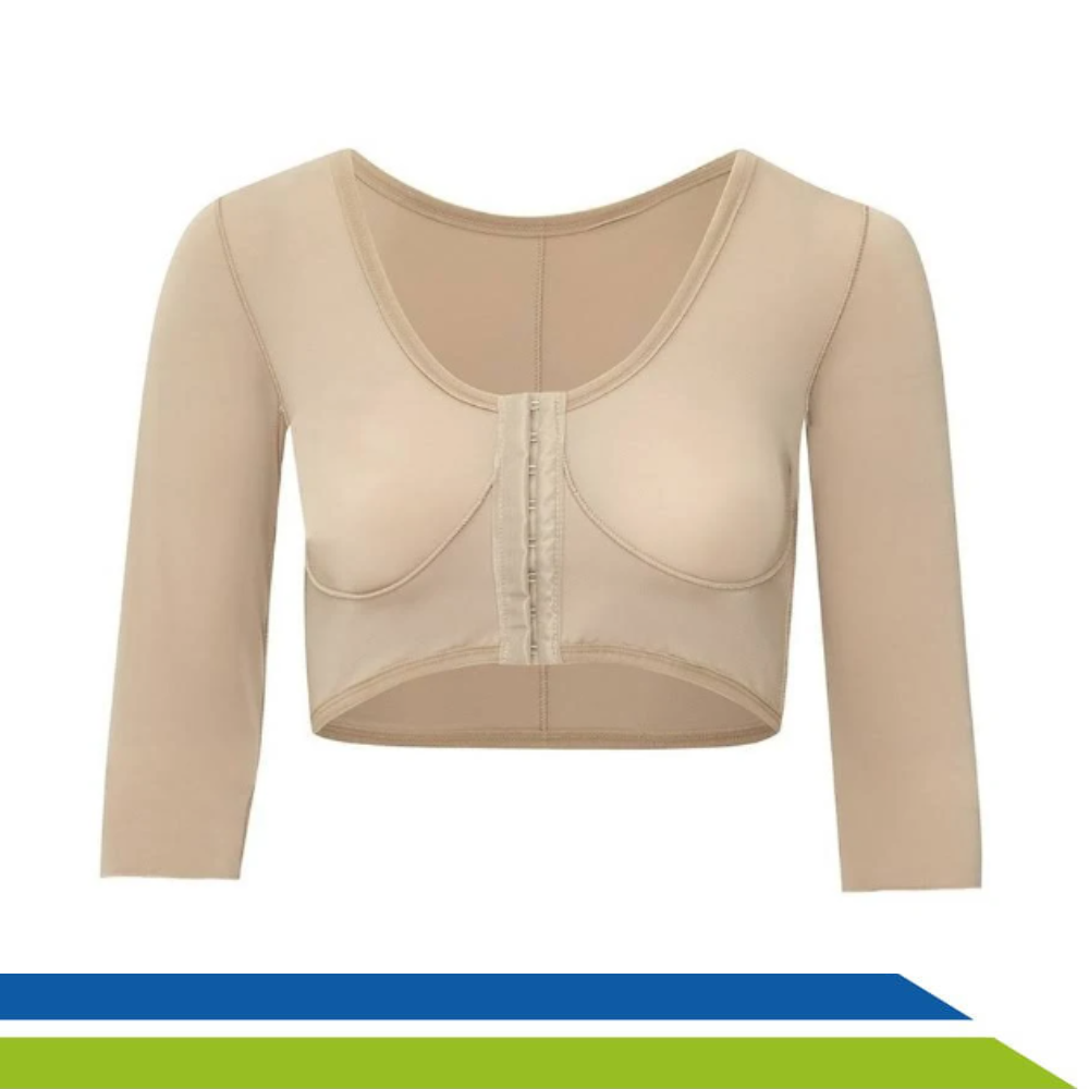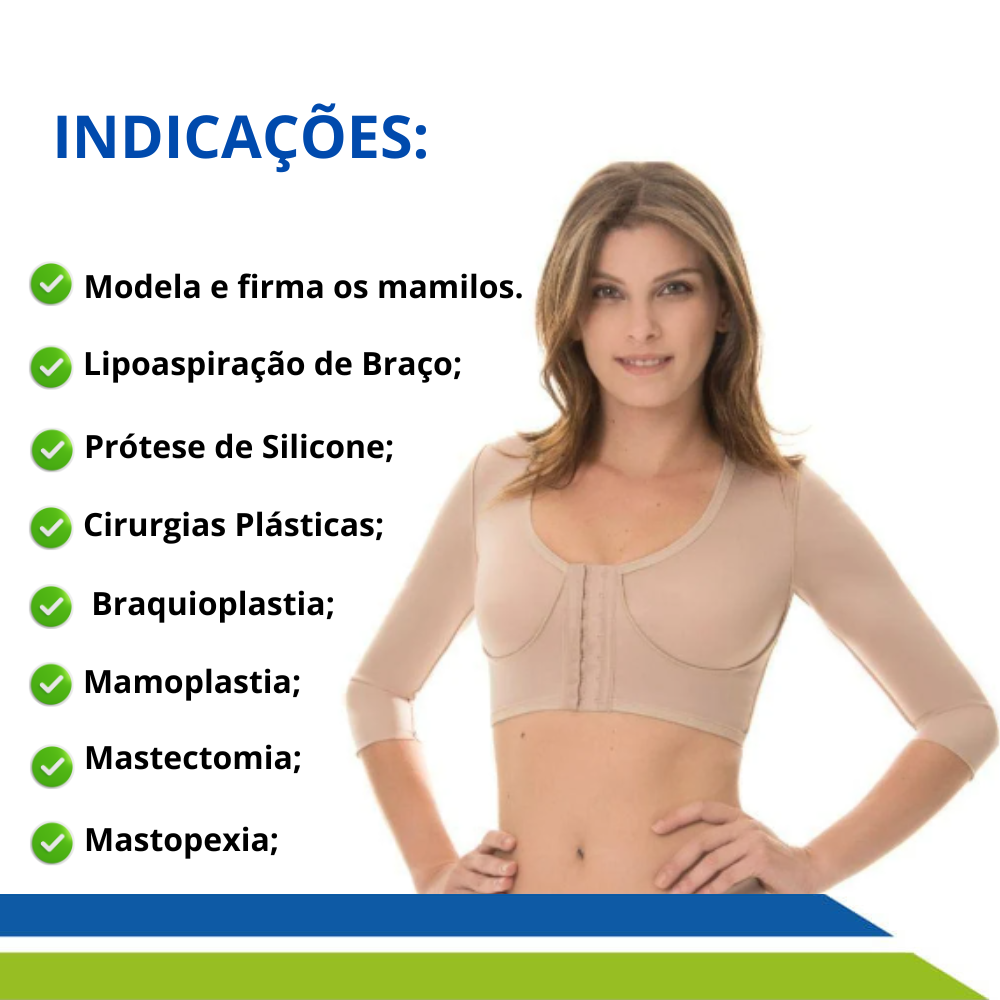 Produzida em poliamida e elastano, o sutiã como mangas 3/4 compressivas auxilia a melhora da circulação sanguínea, evitando o aumento da fibrose e do inchaço que surgem devido ao Pós-Operatório.