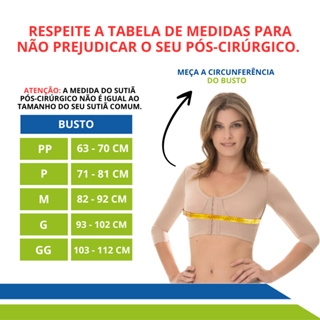 Para tirar a medida certinho, você precisa posicionar a fita métrica na altura dos seios, logo após compare as suas medidas com a tabela de medidas.