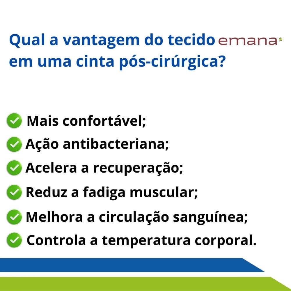 Confeccionado em tecido Emana, estimula a circulação sanguínea e melhora a elasticidade da pele, além oferecer um toque suave e agradável, proporcionando bem-estar durante todo o processo Pós-Operatório.